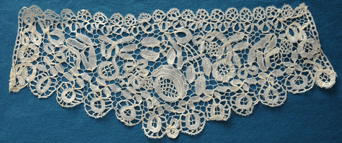 Comments: A border of Belgian bobbinlace with droschel ground, mid 18th c. It has been shaped at one end by cutting down, and I think another narrower piece, not matching, added. Perhaps to fit as a sleeve ruffle? The work itself is well done although a little loosely woven giving the motifs almost a transparent look. Given the modification and a number of small holes in the mesh, condition is short of good for this rather interesting piece.