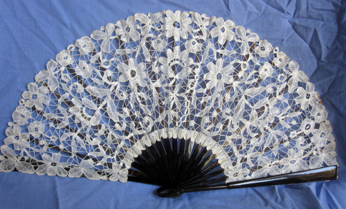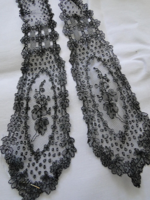 Comments: I always like to review the white silk point ground laces when they come up on Ebay since they don’t very often appear and are always quite interesting. This one is fairly simple and with the extensive half-stitch and honeycomb filling might be a Chantilly variation. It is quite delicate and looks in very good condition. Wish there were more.
