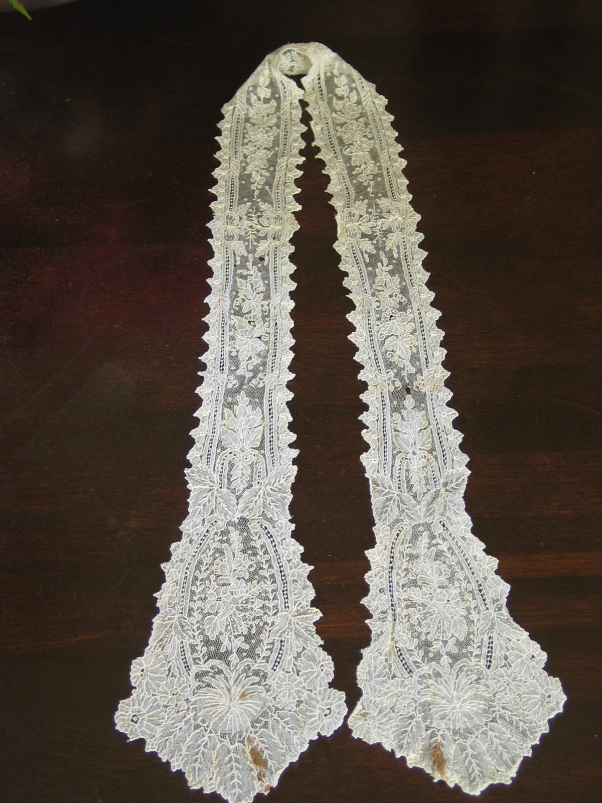 Comments: Joined lappets of what looks like Italian coraline, late 17th c. I’m going to assume this is needlelace, because the photos aren’t close enough to show the detailed stitch structure. If so, you can see where early examples of Irish Crochet gets its inspiration. Or, it could be a later copy. No photos of the mid-join area, so it’s hard to say if this is two separate or one complete piece. I think we need more detail here. Overall it looks in very good condition.