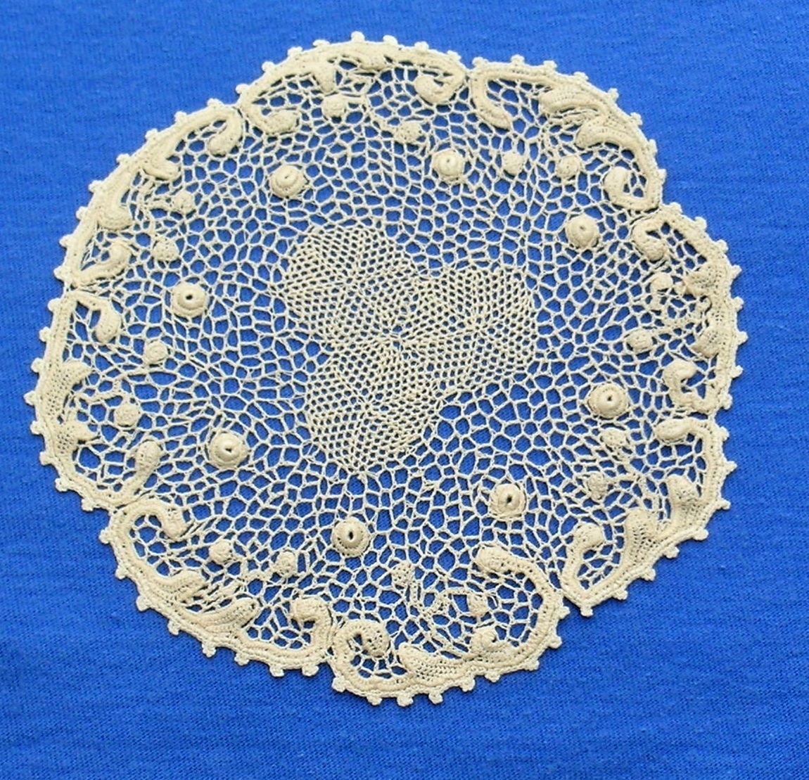 Comments: A Maltese handkerchief with a round silk center. Unusual because there are no Maltese crosses – just roundels of flowers around the edge, and masses of woven leaves next to the center. Minor pulls, but overall very good condition.