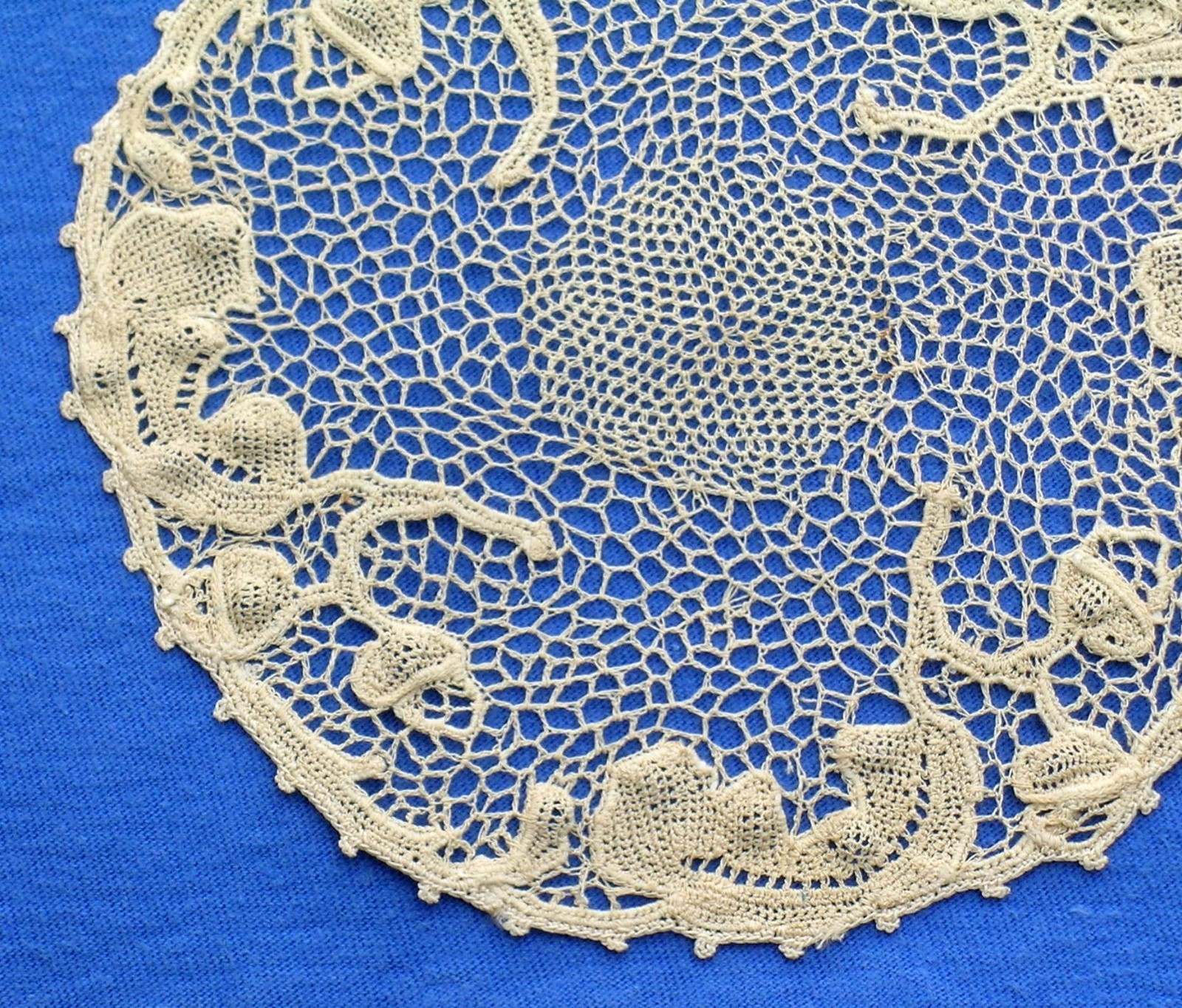 Comments: A collar of Irish Crochet in very good condition. The design is a bit haphazard, with well worked motifs and a little raised work in flower centers. I do like the fillings in the motifs. Picots in the square mesh look like crocheted loops.