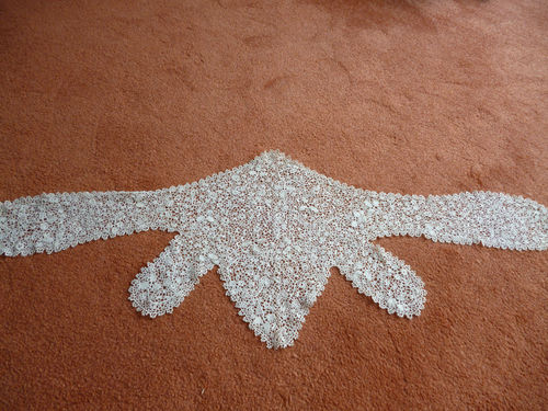 Comments: A Carrickmacross applique collar with deep points. Basically a shamrock design with good needlerun fillings in open swirls around the outer edge. It has a nice style. A few pinholes in the net and the outer edge, especially along the neckline closing is a little frayed. Almost looks more from the making than from actual wear. Overall good condition.