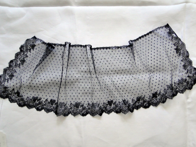 Comments: A Point de Gaze small collar with raised petal roses. Note the connected picots around the edges, sign of an unknown manufacturer It’s a little plain, no fancy ‘mode’ fillings, but it has a nice bold looks that does well in this form. A few pinholes in the mesh, one reattachment needed. Overall good condition.