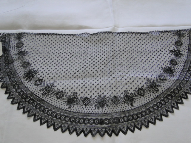 Comments: A small triangular Point de Gaze shawl, a little more like a collar than a shawl. The needlelace is quite finely done, not raised work, but that’s not a problem. It has a few ‘mode’ decorative fillings, but mostly relies on beautifully controlled clothwork in the motifs for effect. Note the single spiked picots along the edge, sign of an unfortunately unknown manufacturer. There are quite a few small holes in the Point de Gaze mesh, very difficult to repair, but they don’t detract much from the piece. Also a little discolored in places. Overall good condition.