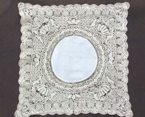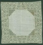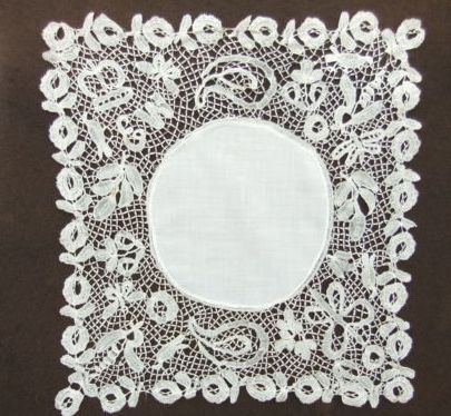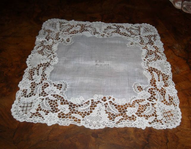 Comments: A Duchesse de Bruges handkerchief, no needlelace. Basically the design is formed from a flower and single leaf in several combinations, very simple, but effective. Un-ornamented plaited brides. I like the way the design goes up into the linen. A few stains, but basically very good condition.