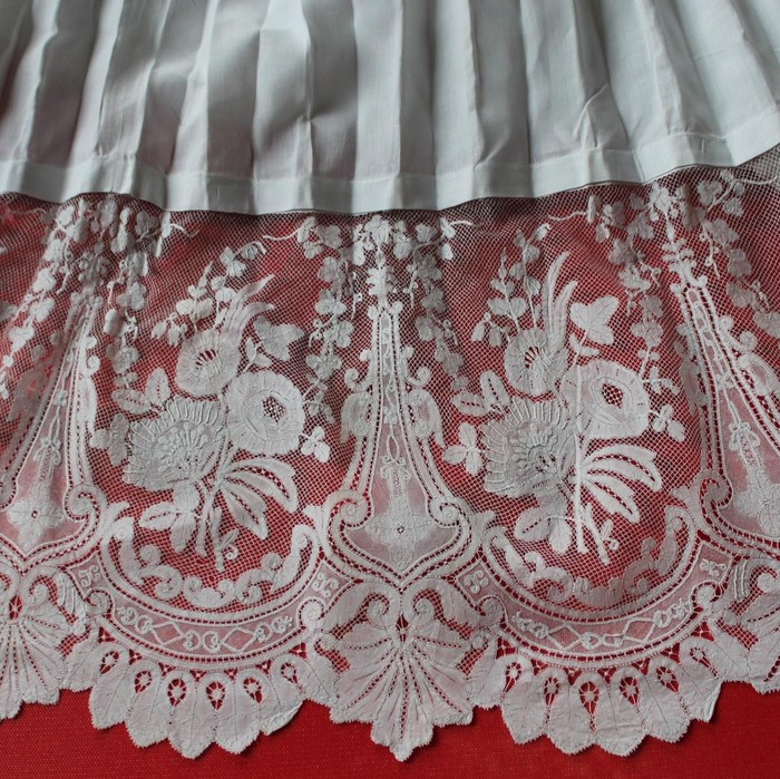Comments: This border has a Point de Gaze ground with bobbin motifs, meaning 19th century Point d’Angleterre. Yet it also has a more conventional Point de Gaze rose insert without raised petals. Belgian lacemakers often combined techniques, and Point d’Angleterre was normally a high end product. This one isn’t quite as over-the-top as you sometimes see, but still quite good. Photos on this are pretty over-exposed, but I think the condition is very good, no major problems.