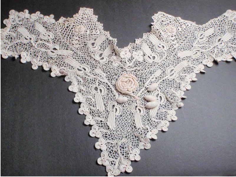 Comments: This piece was sold back in November, so not sure why it’s come up again http://tinyurl.com/6w6andz. It’s a Honiton Point collar, a little on the snails/slugs side, with roses and thistle design. A few minor holes, but overall condition is very good.