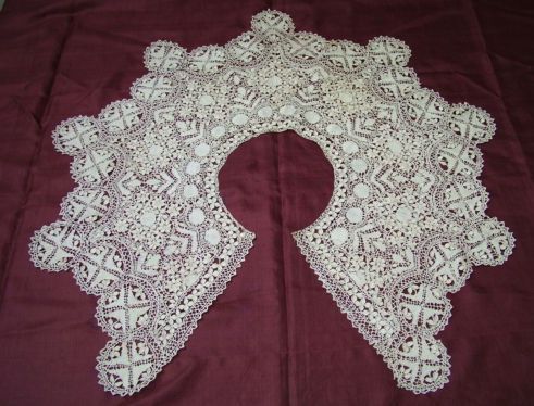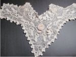 Comments: A small, well made Point de Gaze collar set. At least I think it’s a collar. The work is crisp and sharp, note the windows in the raised petals of the roses. The edge picots are looped in imitation of Alençon horsehair. Good fillings, unusual designs. Very good condition – I think the off color of the raised petals came with the piece.