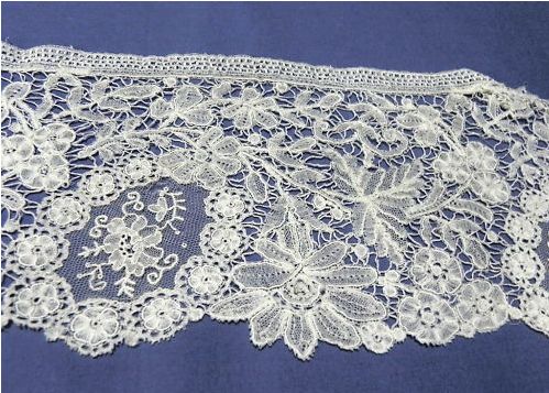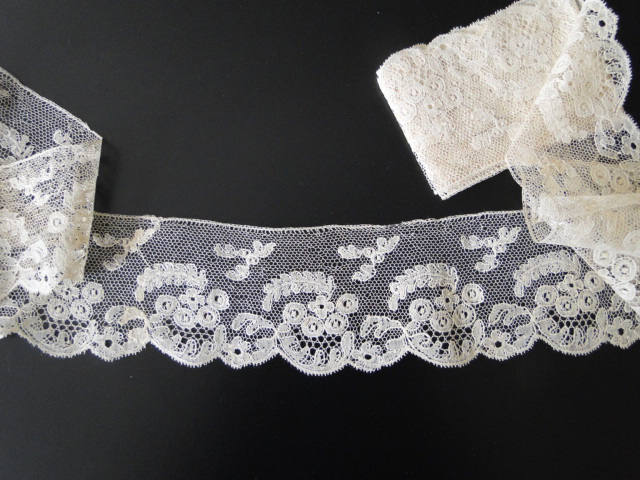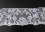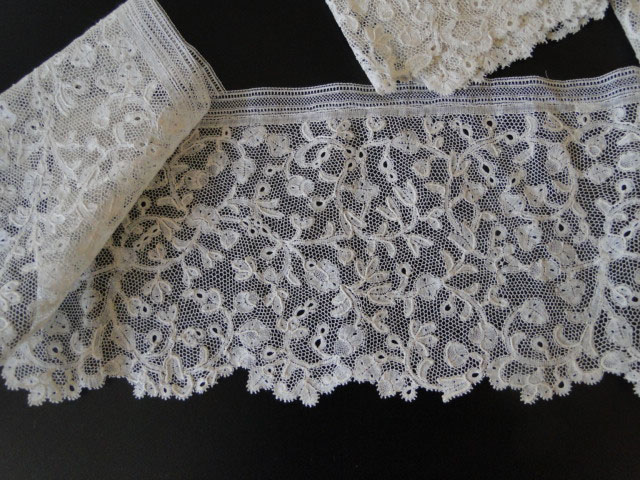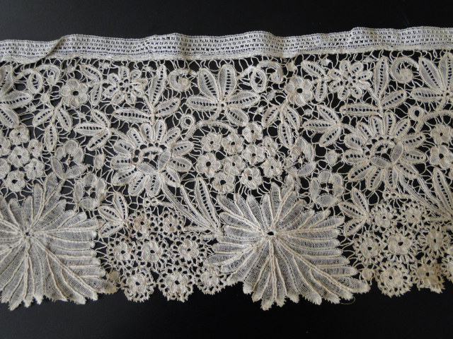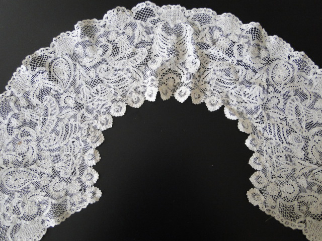 Comments: Wide flounce of Belgian piece bobbinlace, more on the Bruges side than Duchesse. No needlelace point de gaze inserts. Looks to be a cream color with some localized brown spots. Lace looks in very good condition.