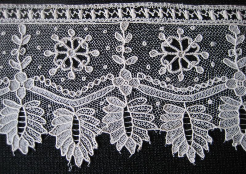 Comments: I thought these two piece would make a nice comparison. They are both pieced bobbinlaces with bride grounds; one a Honiton from England, the other a Brugge from Belgium. The Honiton has the meandering design sometimes called ‘snails and slugs’ – and I think this one has been photographed from the wrong side. The Brugge is a little more organized design, nicely worked motifs with some interesting raised work. Both appear to be in very good condition. They are very typical examples in a kind of mid-quality range.