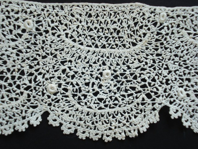 Comments: Duchesse with needlelace inserts. Good raised work on the bobbinlace. The needlelace is a little sparse. I like the design of this piece, and condition looks basically good. Some age discoloration.