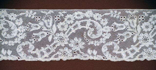 Comments: Nice 2nd quarter 18th c Mechlin length – narrow but very long. Snowflake fillings. I’m thinking that the picot edge might be a later addition – not enough closeup photos to tell definitively. It’s a common 19th c ‘improvement’ since the slight picots of the original weren’t in fashion. Usually not difficult to remove, if desired.