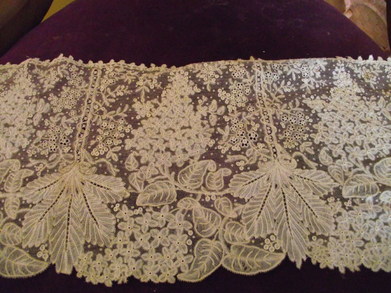 Comments: This piece is 19th century Point d’Angleterre, combination bobbin and needlelace. Very high quality, too bad about the length (22″ on top, 34″ on bottom, 7″ wide). It would be a major piece if there were more of it. I wrote to the seller about this, they never replied.