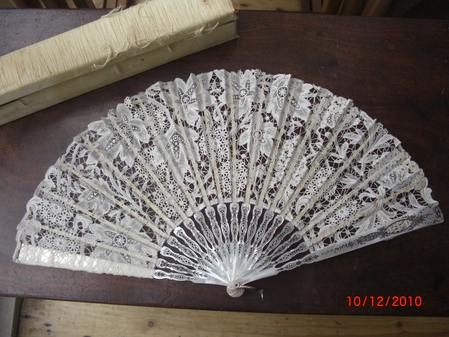 http://tinyurl.com/22nthb7 Antique Brussels lace and Mother-of-Pearl sticks fan.