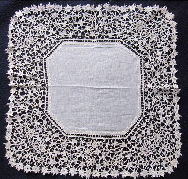 Comments: Very good flat Belgian needlelace handkerchiefs. These two are so similar that they must have been made by the same manufacturer. Very interesting to compare the two. I do like the first one best, the second pushes it a bit too far, and isn’t helped by the monogram.