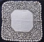 Comments: Very good Carrickmacross handkerchief, the net applique type. Typical loops on the outside border, nice fillings of embroidered net. People often wait for very large pieces of this, but one should not ignore the really nice smaller ones.