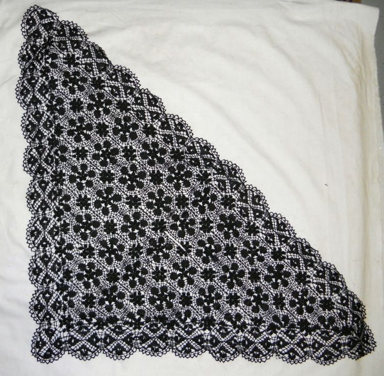 Comments: I’ve never seen anything quite like this before. Can’t tell if it is silk. Certainly a blonde technique, but I’m not sure where it’s from. Center embroidery doesn’t do much for the piece.