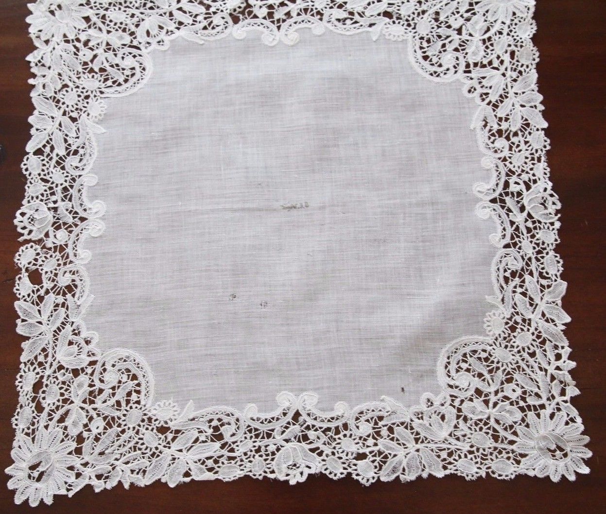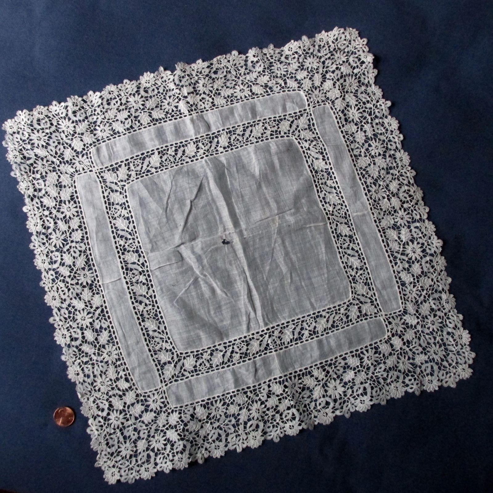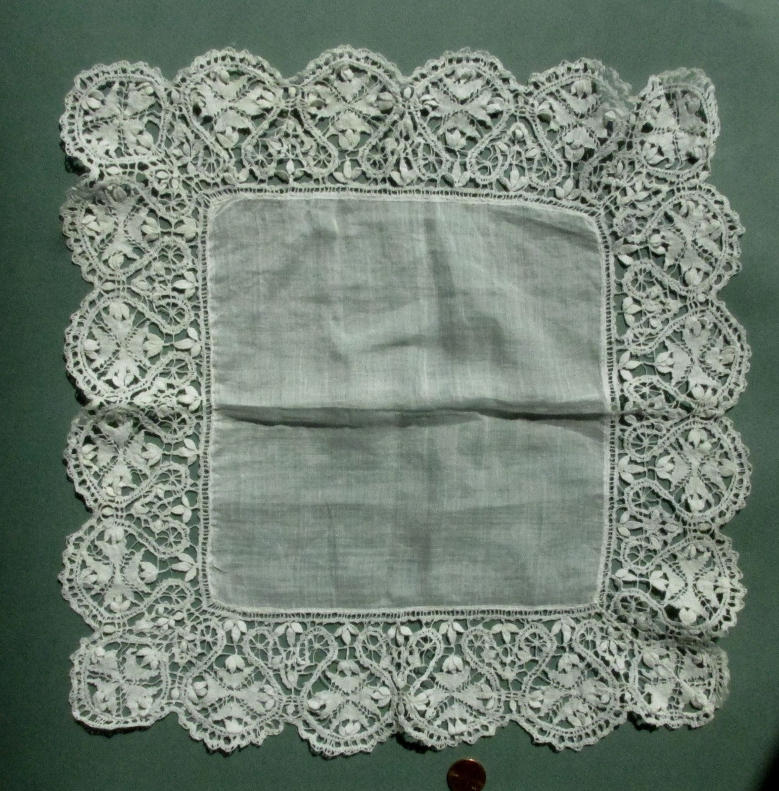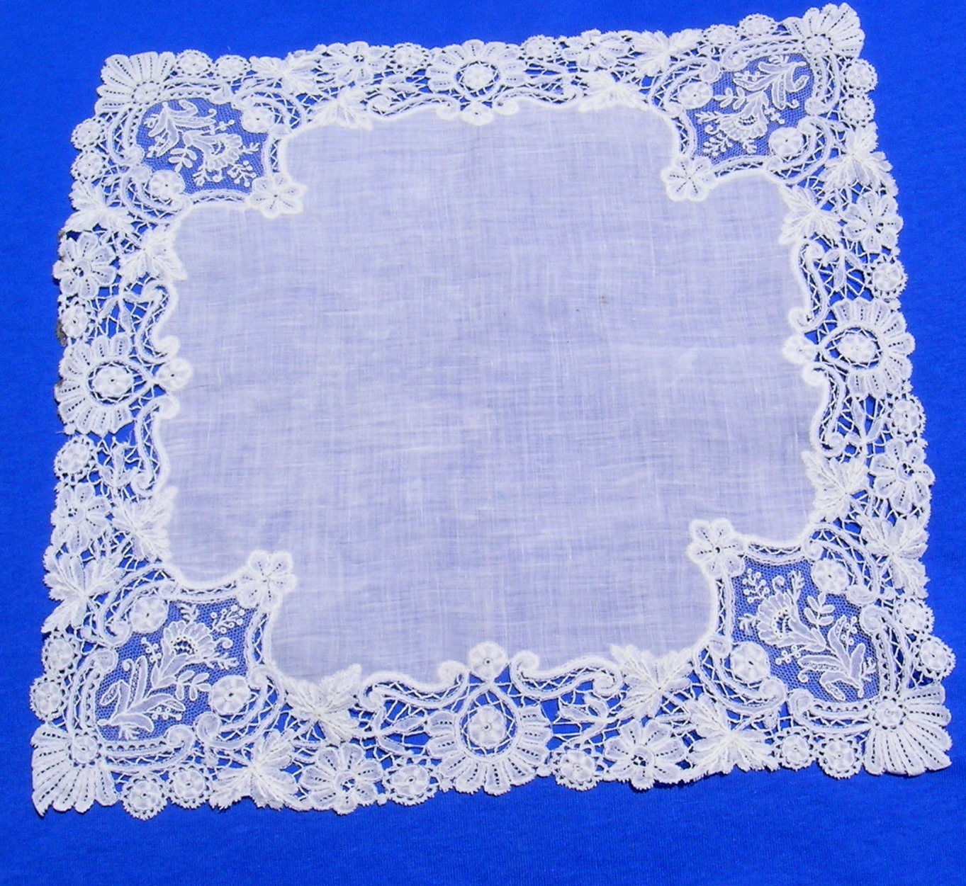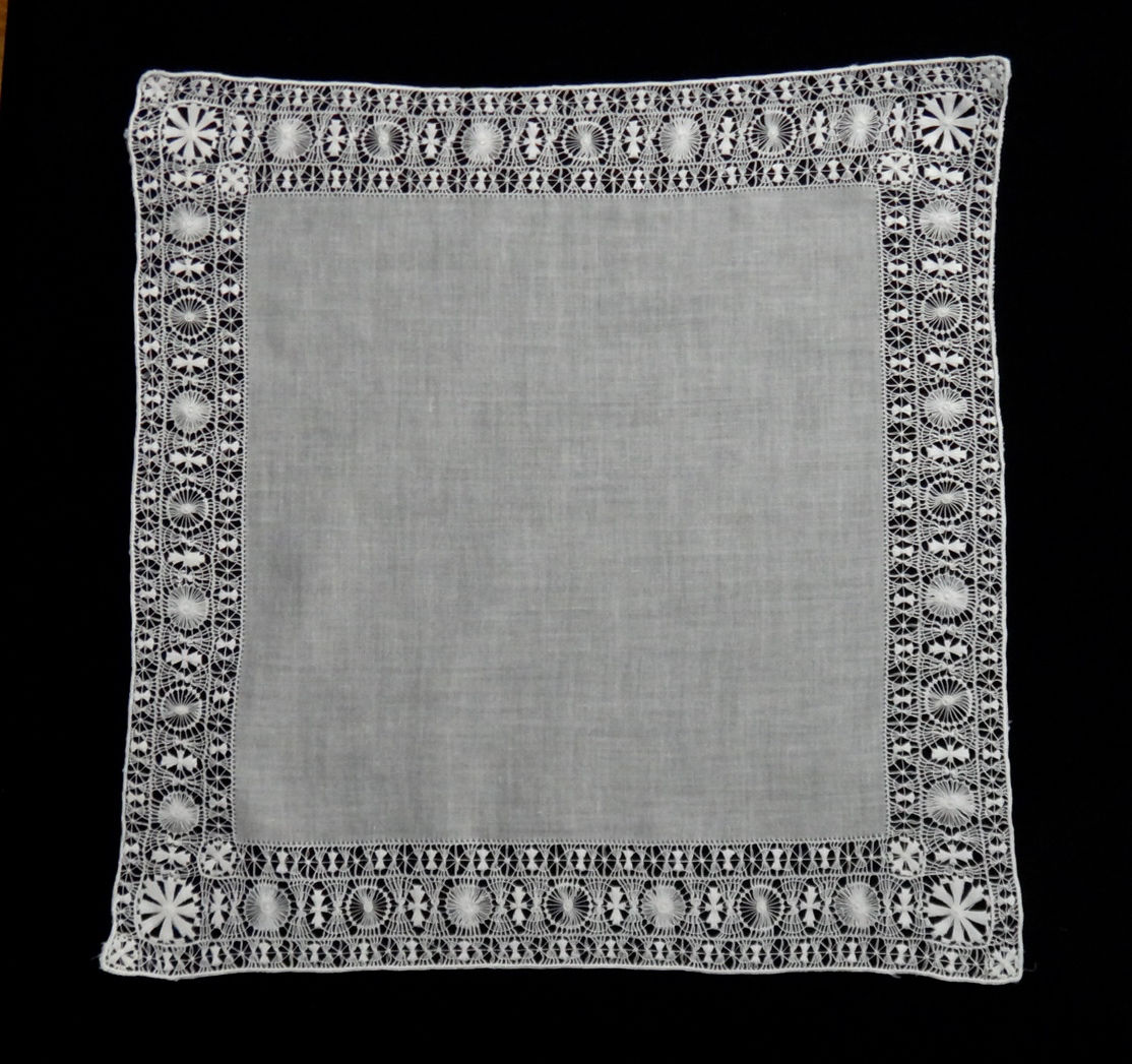 Comments: A handkerchief of Brussels bobbinlace applique on machine net. The design is conventional florals in a middle-market product. I do like the inner edge treatment and could only imagine the improvement if the cloth followed those outlines. And the overall design is well filled, nice presence when viewed in its entirety.