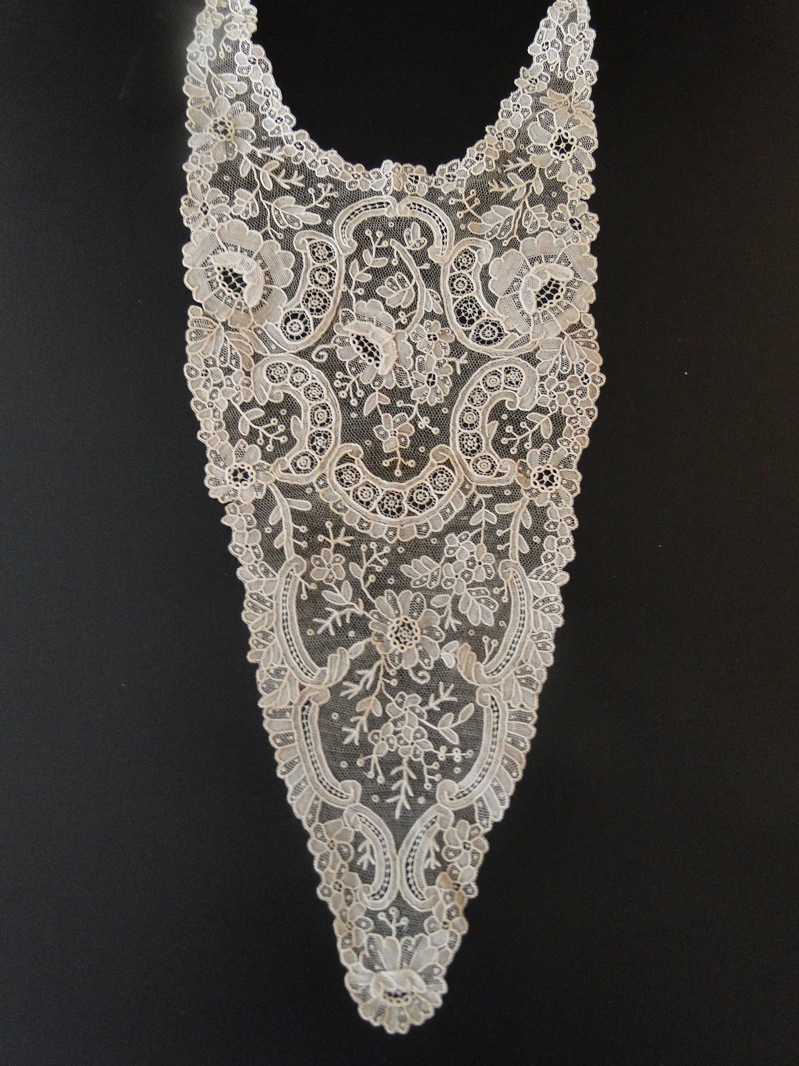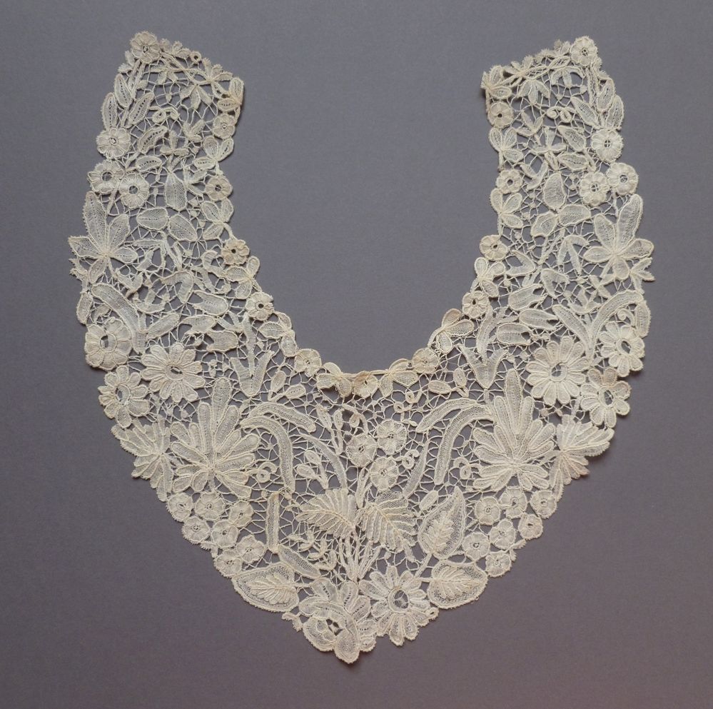 Comments: A Duchesse de Bruxelles collar with long points. No raised work in the Point de Gaze inserts. There is raised work in the bobbinlace against halfstitch ground in the strapwork. Conventional bobbinlace motifs – nice small buds along the neckline.