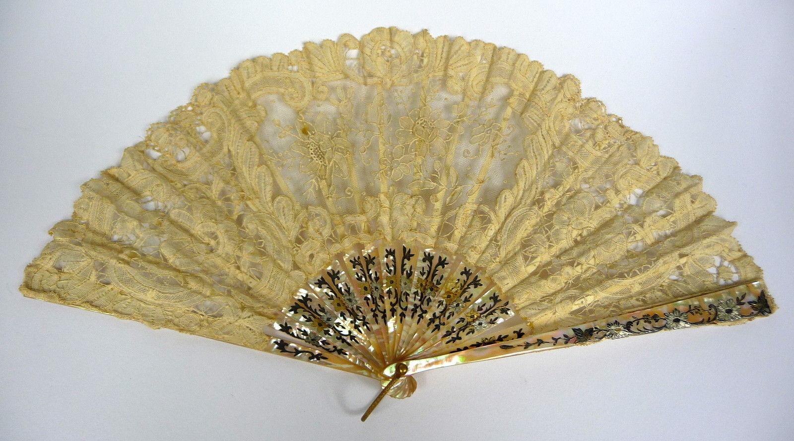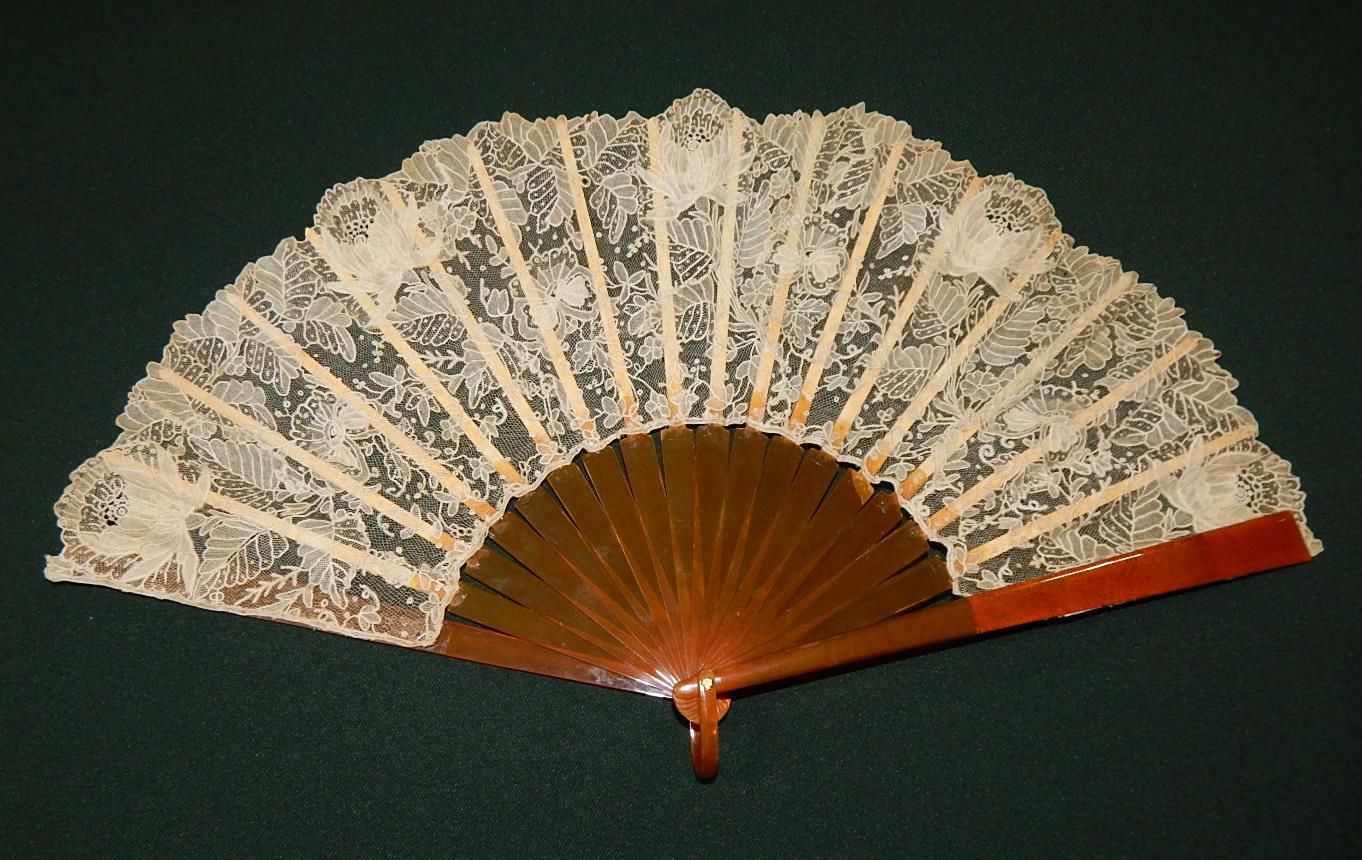 Comments: Hard to tell given the background cloth, but this does appear to be Chantilly. Typical romantic floral design, from what I can tell. Imitation tortoiseshell sticks.