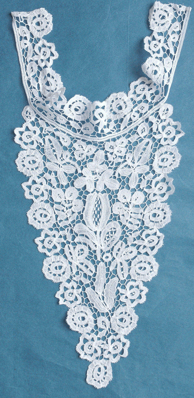Comments: A Honiton guipure bertha, moderately rare form for Honiton. Snails/slugs style with woven picoted brides.