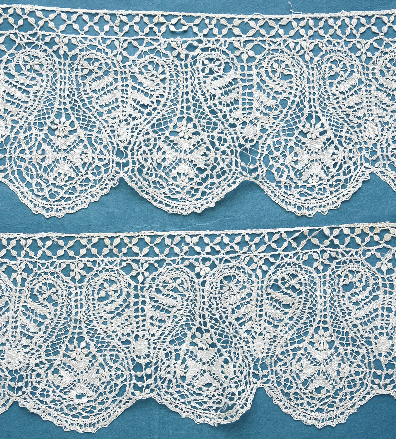 Comments: A long border of cream silk Maltese. Well worked designed of alternating crosses and flowers with a wheat-ear scalloped edging. I also like the straight edge treatment. Good example, and the length is exceptional.