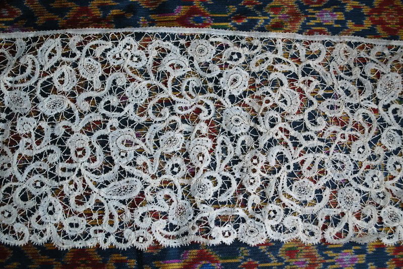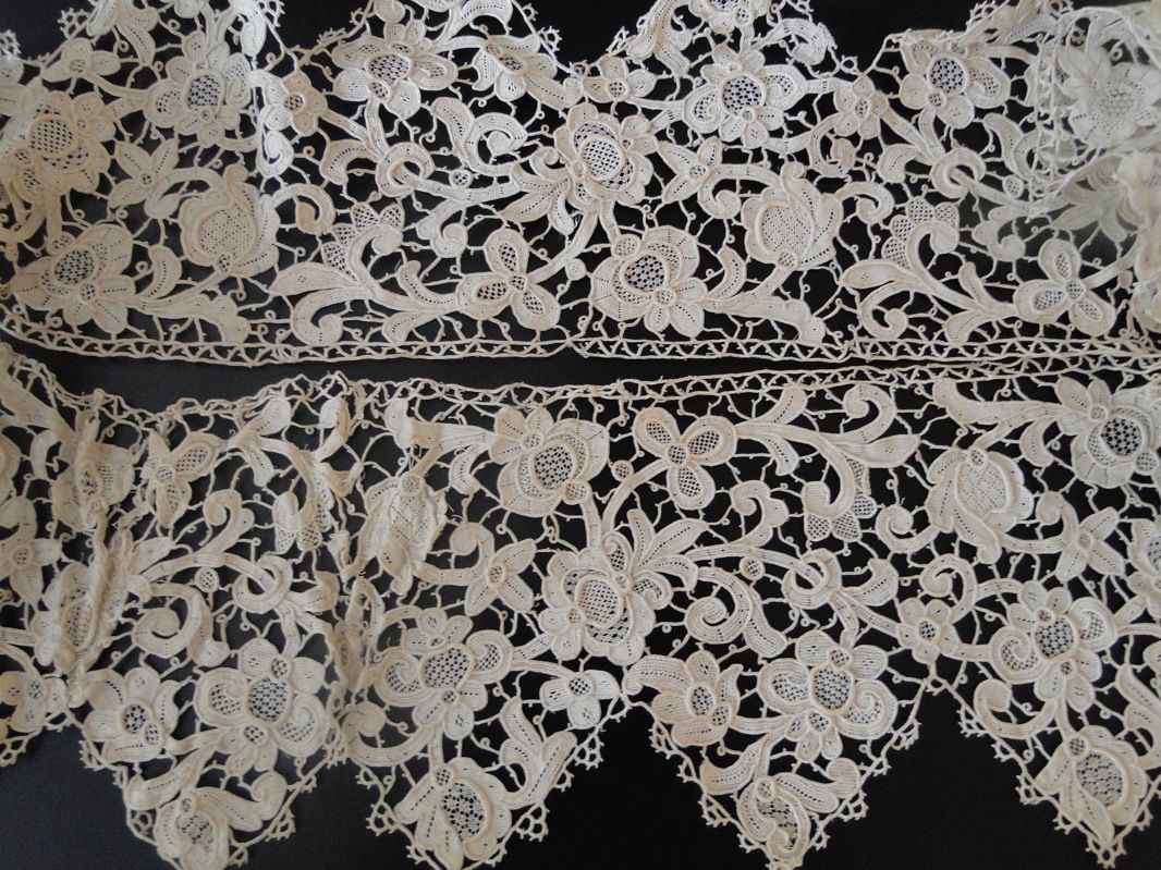 Comments: Silk Blonde de Caen border with the typical heavy scalloped edge and large buds used as esprits. This type of lace doesn’t survive well, and is quite impressive at its best. This one has seen better days, but is a good example of the type.