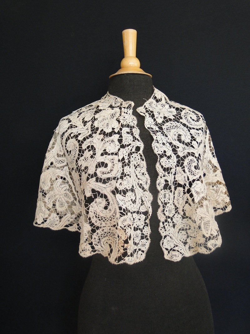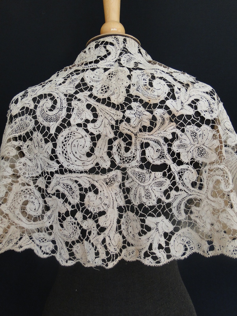 Comments: An embroidered machine mantilla with attached collar. Heavily embroidered with tambour, and I think there are needlerun filling stitches. Impressive design at the back, with similarly decorated rectangular ends. Irish or Belgian – this is an unusual form.