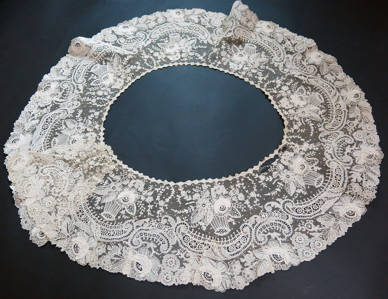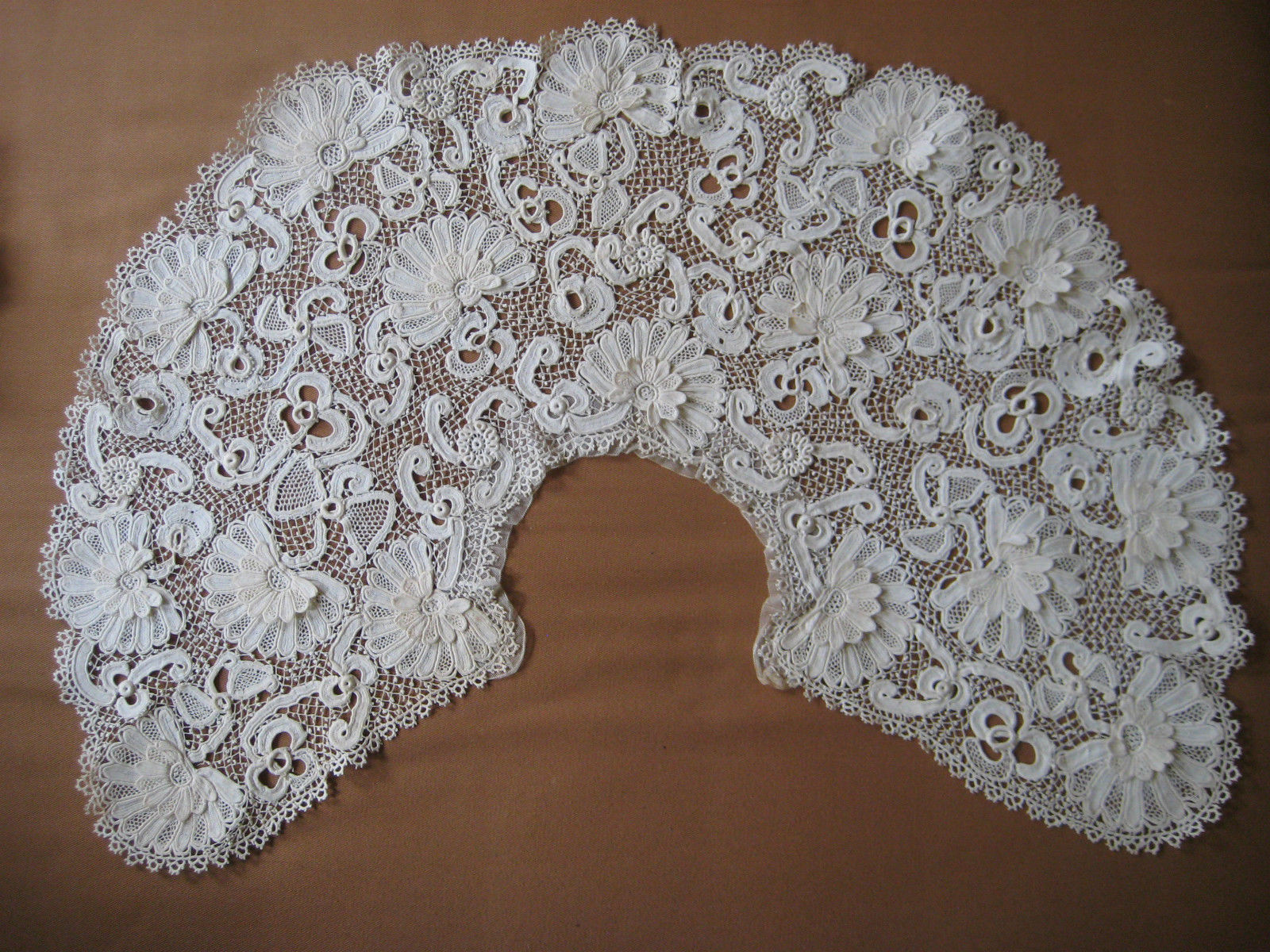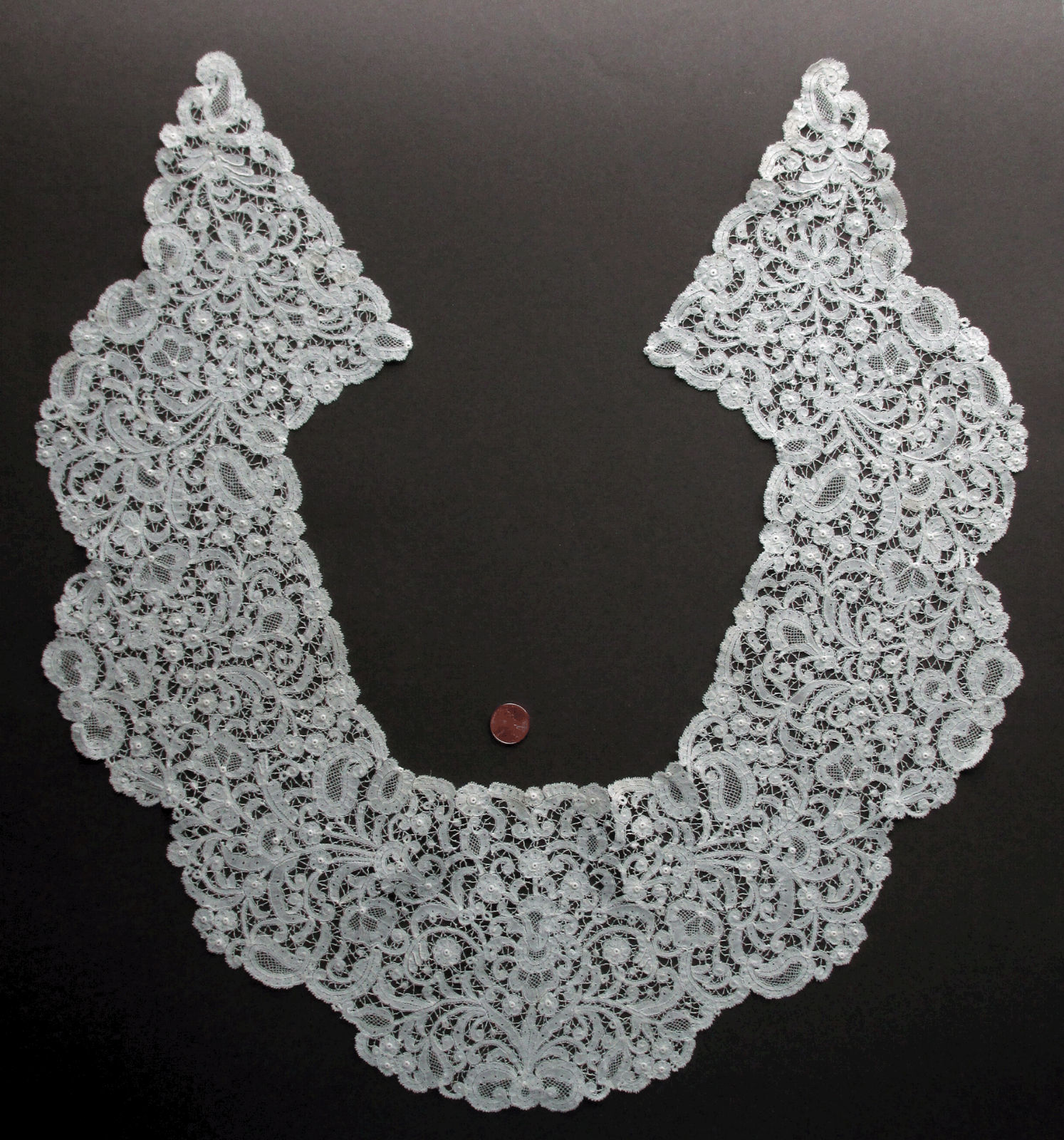 Comments: A high-end market large Belgian needlelace collar. Note the spacing of the buttonhole stitches on the raised edges, and also the insert that has a lot of Point de Gaze techniques but in a heavier thread – all marks of a Belgian product. There are a few heavy raised edges, without much sculpting in depth, another Belgian mark. Also the precis clothwork with some diamond window decoration. The little ‘islands’ where brides meet recall what you see in Bruges bloemwerk. Might be a Zele piece.