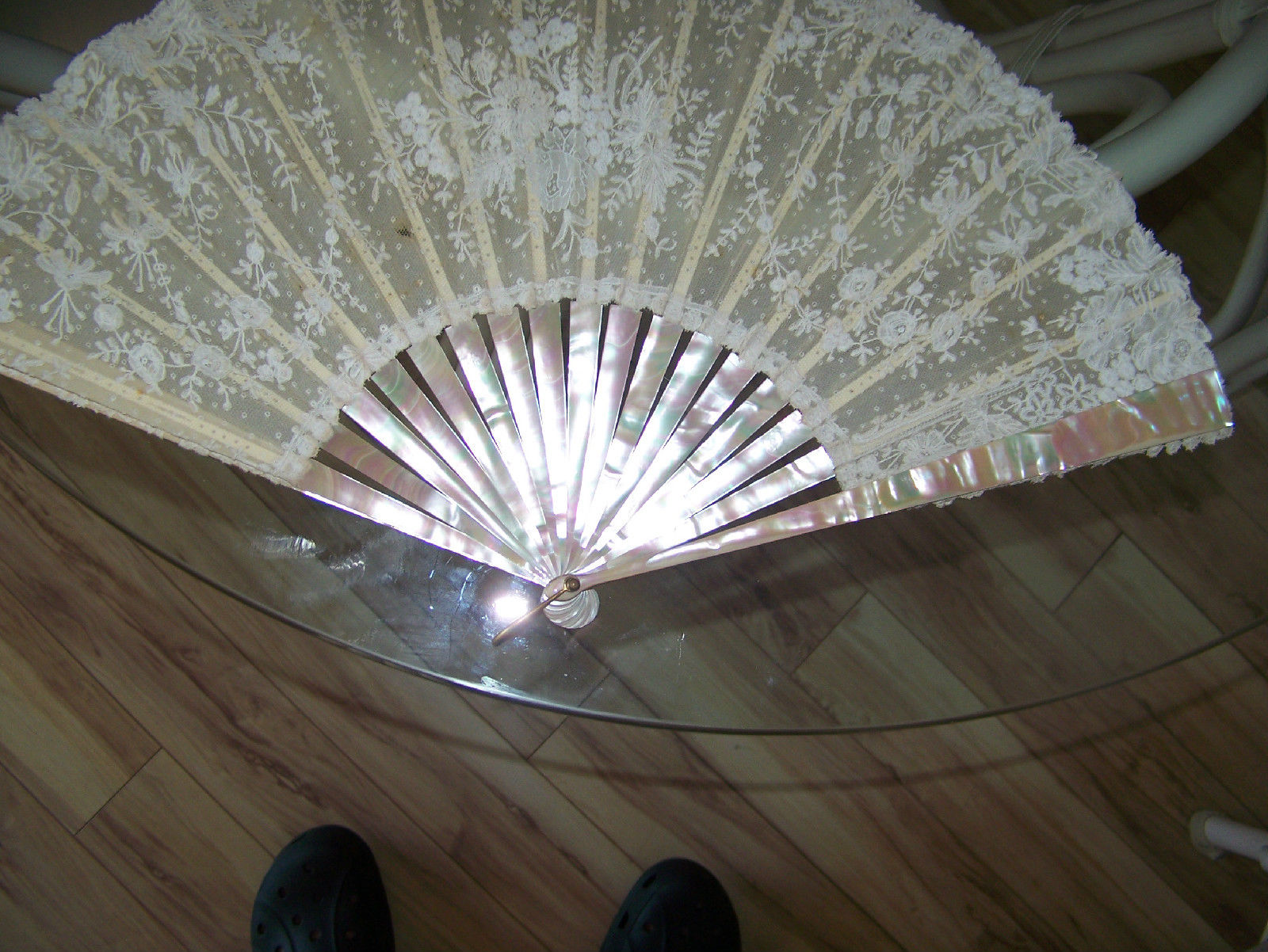 http://tinyurl.com/q2pzd64 BEAUTIFUL “TIFFANY” ANTIQUE HAND FAN EARLY 1900’S LACE AND MOTHER OF PEARL