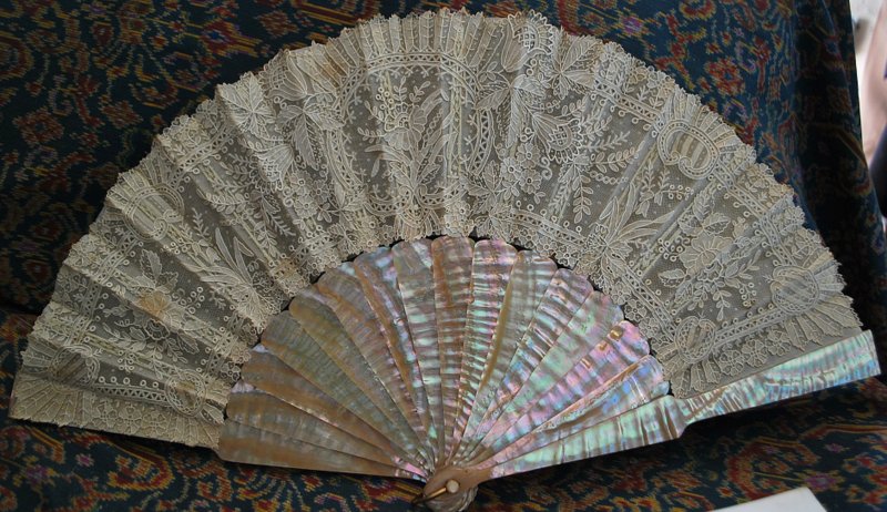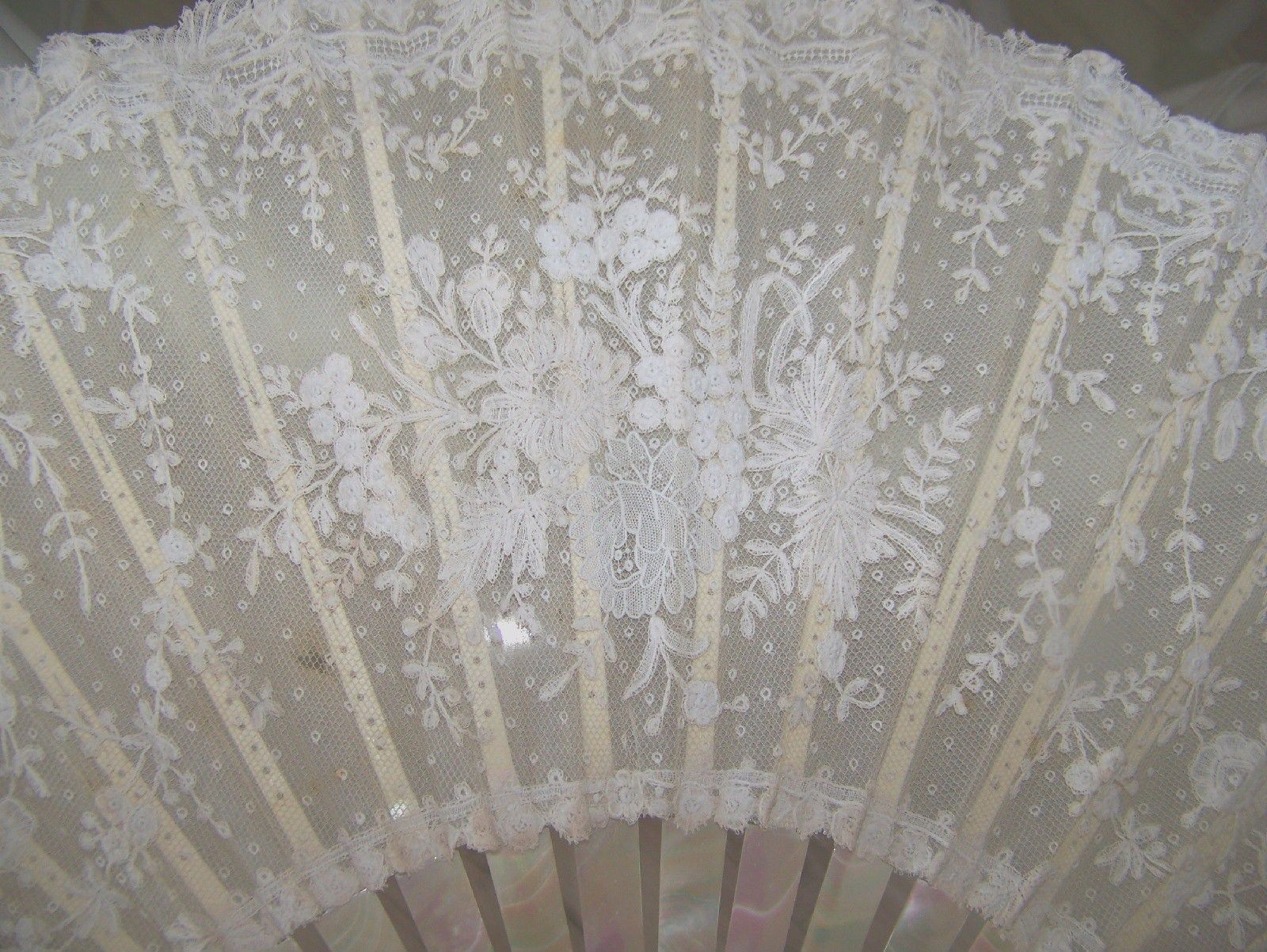 Comments: A rather large fan of Brussels bobbin and needlelace applique on machine net, with plain Mother of Pearl Sticks. The lace is backed with a white gauze or net. Good romantic floral design – one of the center roses is done in Point de Gaze, but no PtdG ground that I can see. Fillings are needle-made and simple. Note the Rosaline perle-like small flowers in the center spray. Many small circular esprits in the tulle. Good romantic floral design with some interesting hanging flowers, not just roses and leaves.