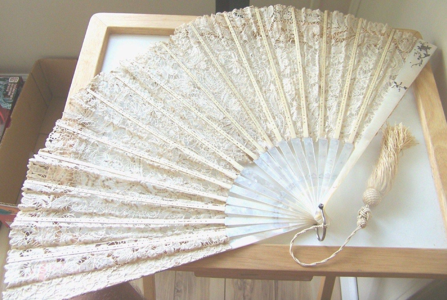 http://tinyurl.com/ps6exrq ANTIQUE ESTATE EXQUISITE HAND PT DE GAZE LACE FAN MOTHER OF PEARL STICK PERFECT