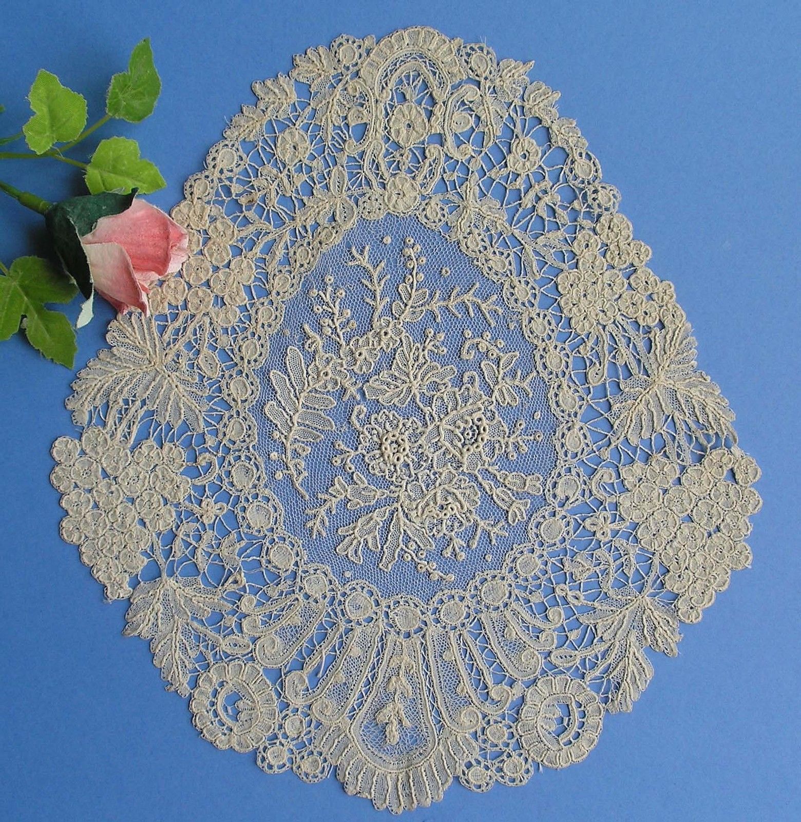 Comments: I’ll put these four small pieces together. Of the three collars, two are Point d’Angleterre (late 19th c bobbinlace with Pt de Gaze ground), and the third is Point de Gaze. The little mat (not sure what it is), is Brussels Duchesse with no raised work in the center Point de Gaze insert. All together these are a nice sampling of late 19th c Belgian work. They are all nicely done, and note the good raised work in the bobbinlace in the Duchesse. I like the two Pt d’Angleterre pieces best, good small work on the bobbinlace, and one has some nice decorative ‘mode’ fillings, along with some needle-made flowers along the outer edge.