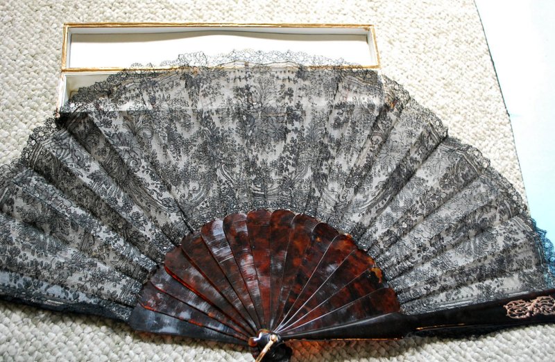 Comments: A Chantilly fan with boxed labelled “Alouise Van de Voordu, Paris”. Seller says the sticks are natural, if this means tortoiseshell, be very careful with import and export laws. There are what look like scratch marks on the sticks, consistent with folding, but I’m not convinced that this is tortoiseshell. I’d expect some warpage in in natural material. They are elaborately pierced in the slip area, with a gold monogram on the front guardstick. The lace is a finely worked Chantilly, no ombré shading, and no elaborate fillings. Note a light silk? backing has helped preserve the lace.