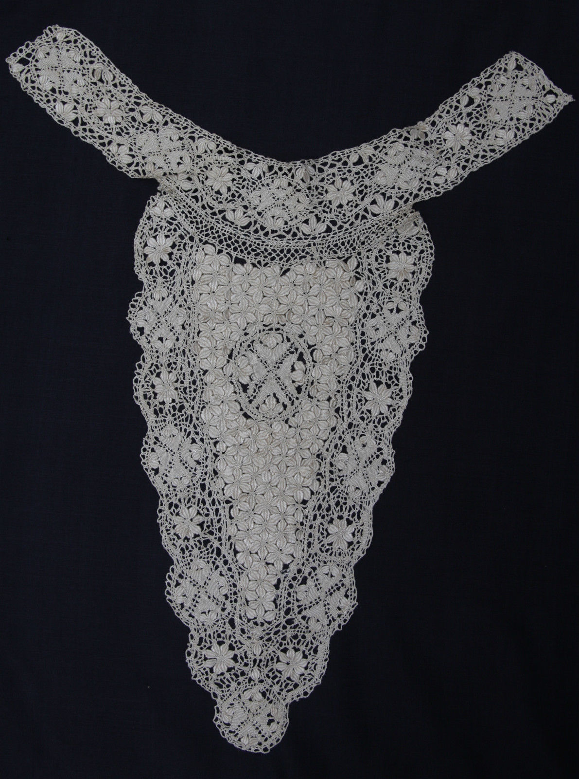 Comments: A triangular dress front insert with choker collar, cream silk Maltese bobbinlace. Nice matted woven leaf work inside the triangle with a Maltese cross in the center. The edges and collar alternate crosses and flowers. The collar and insert appear to match.