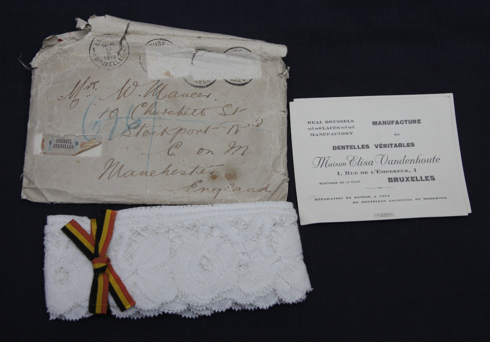 Comments: Material such as this is extremely rare. An unused border of Bruges Bloemwerk, as packaged with the original envelope from Brussels to Manchester England dated 1919 (this could be a War Lace piece), and the retailer’s card, Maison Elisa Vandenhoute. It’s not an especially remarkable piece of lace, but the package of everything together is exceptional.